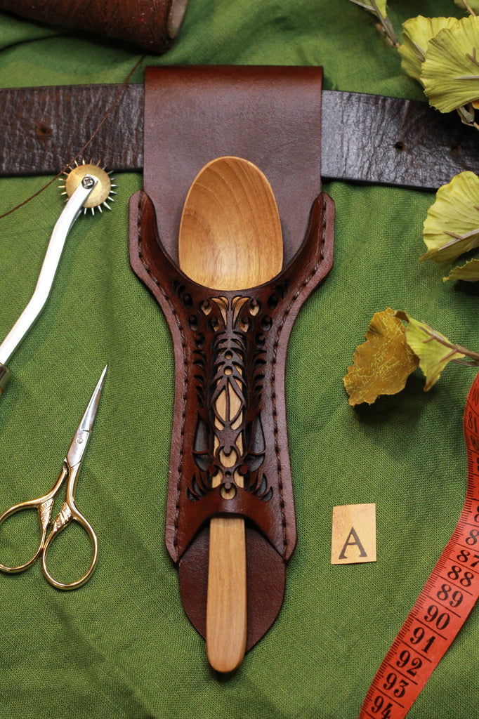Each leather holster is delicately laser cut with an intricate floral pattern and hand stitched with waxed thread. The loop at the top is securely riveted in place and fits up to a 2 inch wide belt. The holsters are then wet molded to their individual spoon, which ensured a snug fit and no lost spoons. The spoon shown is INCLUDED with your holster! The spoons are food safe but not suitable for high temperatures, so keep them out of boiling soup!